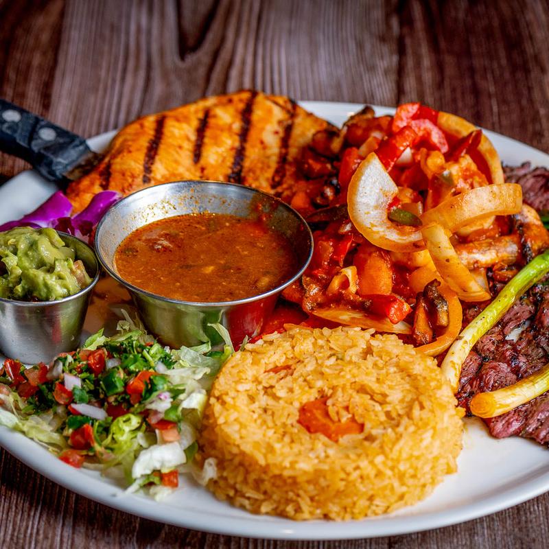 Served sizzling in a hot skillet with rice, beans, lettuce, sour cream, tomatoes, shredded cheese, guacamole, and warm tortillas on the side.